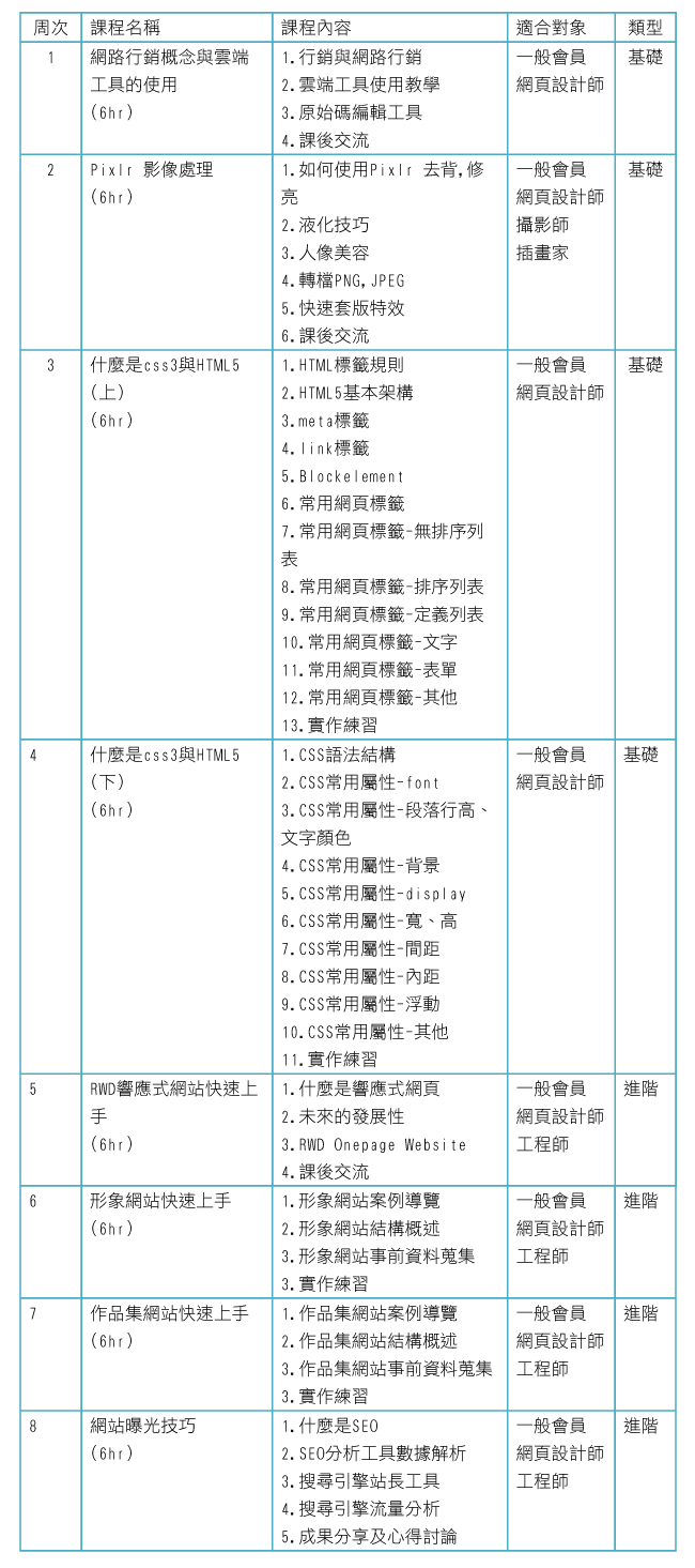 目前平台會員課程規劃為兩種,一種為一般課程,適合想從事網頁相關工作或對此有興趣的一般民眾,一般課程又分基礎及進階兩階段;另一種為精英課程,適合想透過平台接案的網頁設計師或其他網站從業人員。精英課程受訓完成並通過考核後,即可成為駐站人員,透過平台接案分潤。不同的會員可以參與不同的進修課程,預計計畫時程內規劃一般課程 8堂(4 堂基礎課程,4 堂進階課程),及整套 8 堂課的精英課程,並定期調查會員需要來調整課程內容。目前暫定規劃之一般課程如右表所列: